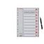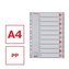 Rejstříky pro číselné roztřídění dokumentů v pořadačích či deskách do formátu A4 s popisovatelnou titulní stranou. Zesílená multiperforace plastovým proužkem na titulní straně. 10 dělicích listů se štítky 1-10 pro rychlou orientaci v obsahu. Univerzální multiperforace (11 děr) pro založení do pákového i kroužkového pořadače. Pro formát A4. Vyrobeno z polypropylenu (PP) tloušťky 0,12 mm. . . . . . .