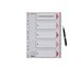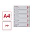 Rejstříky pro číselné roztřídění dokumentů v pořadačích či deskách do formátu A4 s popisovatelnou titulní stranou. Zesílená multiperforace plastovým proužkem na titulní straně. 5 dělicích listů se štítky 1-5 pro rychlou orientaci v obsahu. Univerzální multiperforace (11 děr) pro založení do pákového i kroužkového pořadače. Pro formát A4. Vyrobeno z polypropylenu (PP) tloušťky 0,12 mm.