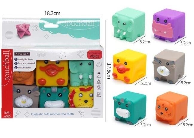 Odkryj wspaniały zestaw miękkich kostek sensorycznych, zaprojektowanych specjalnie z myślą o najmłodszych odkrywcach! Ten uroczy komplet zawiera sześć kolorowych kostek w kształcie sympatycznych zwierzątek: słonika, hipopotama, kaczki, krówki, nosorożca i lwa. Każda kostka charakteryzuje się unikalną, przyjemną w dotyku fakturą, która stymuluje zmysł dotyku dziecka. Dzięki ich inteligentnemu kształtowi i optymalnemu rozmiarowi (5.2 cm x 5.2 cm), kostki są niezwykle łatwe do chwytania i trzymania przez małe rączki, co wspomaga rozwój motoryki małej. Dodatkowo, każda kostka po naciśnięciu wydaje delikatny, przyciągający uwagę dźwięk, rozwijając zmysł słuchu i ciekawość. Wykonane z wysokiej jakości, elastycznego i miękkiego materiału, kostki są bezpieczne dla dzieci już od 18. miesiąca życia. Ich delikatna struktura sprawia, że mogą również łagodzić dyskomfort związany z ząbkowaniem. Zapakowane w estetyczne pudełko o wymiarach 18.3 cm x 17.5 cm, stanowią doskonały pomysł na prezent. Podaruj swojemu dziecku radość odkrywania i bezpieczną zabawę z tymi uroczymi kostkami sensorycznymi!