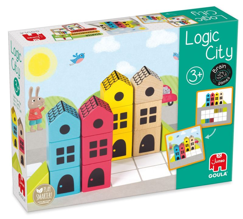 Kiedy zabawa zamienia się w naukę, dziecko uczy się najchętniej. Właśnie na tym opiera się gra Miasto logiki Goula. Zabawa pełna kolorów, pomysłów i przestrzennych zagadek. Maluch próbuje odtworzyć konstrukcję według wzoru, obserwując, analizując i budując krok po kroku swoje drewniane miasto.
