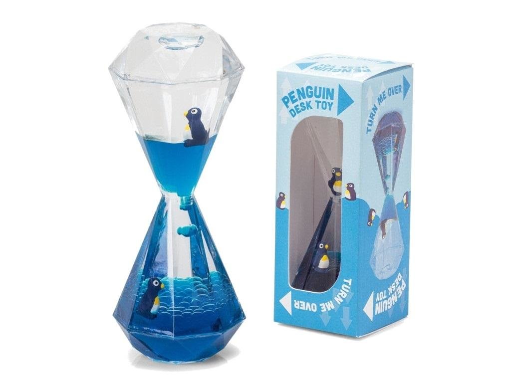 Klepsydra może odmierzać czas poprzez przelewający się, niebieski płyn, z górnej komory do dolnej. Dzięki przezroczystej obudowie w kształcie kryształu klepsydra tworzy ciekawe efekty świetle i iluzje wzrokowe. W obu komorach klepsydry znajdują się niewielkie pingwinki. W czasie przelewania się płynu jeden pingwinek zaczyna się wynurzać, a drugi w tym samym czasie powoli tonąć. Zabawka dla dziecka i jako gadżet na biurko. Klepsydra m 13cm wysokości
