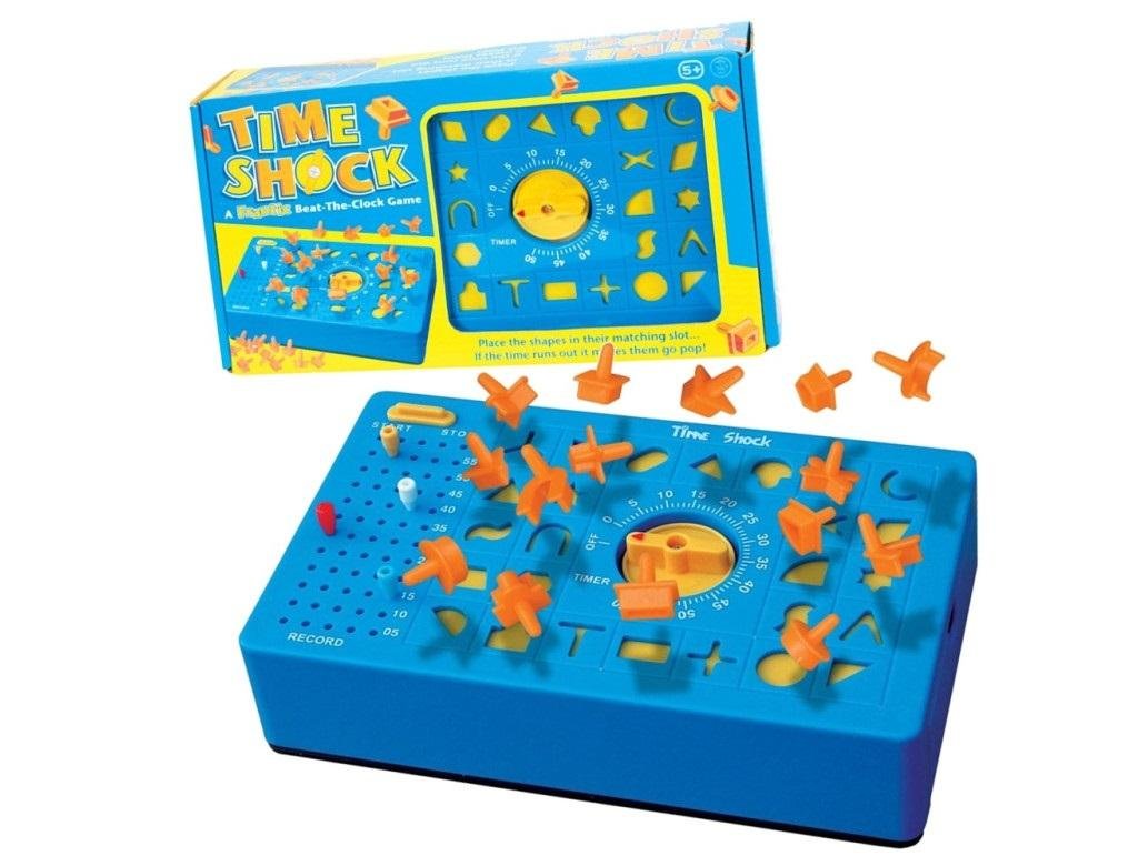 Ćwicząca nerwy i spostrzegawczość zabawka na refleks. Najpierw należy nakręcić zegar, a potem jak najszybciej dopasowywać kształty do odpowiednich otworów. Jeżeli nie zmieścimy się w określonym czasie, wówczas wszystkie figury zostaną wystrzelone w powietrze, a całość trzeba będzie zaczynać od nowa.
