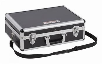 Hliníkový kufr KRT640102B v černé barvě značky Kreator má rozměry 460 x 330 x 155 mm. Pevný box obsahuje polstrování s našitou gumou (ve víku) a s posuvnými přihrádkami (na dně).