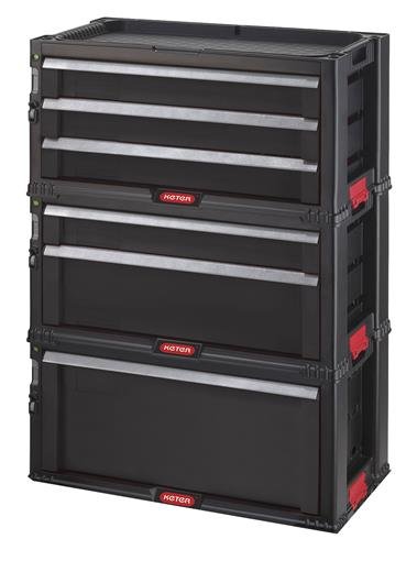 Úložný box na nářadí obsahuje dvě hluboké zásuvky s odnímatelnými přihrádkami, do kterých můžete uložit velké a těžké nástroje. Další 4 zásuvky slouží pro uložení drobnějších nástrojů a příslušenství. Jedna ze čtyř menších zásuvek je vybavena 16 vyjímatelnými organizéry na drobné příslušenství, jako jsou hřebíky, šroubky, hmoždinky a jiné drobnosti. Organizéry umožňují snadné roztřídění příslušenství podle druhů a velikostí. Všechny dělící příčky v zásuvkách lze snadno vyjmout a vytvořit tak volný prostor pro větší nástroje. Každý samotný blok se zásuvkami lze zajistit proti otevření vestavěným posuvným zámkem. Nechybí ani očko pro zajištění visacím zámkem.