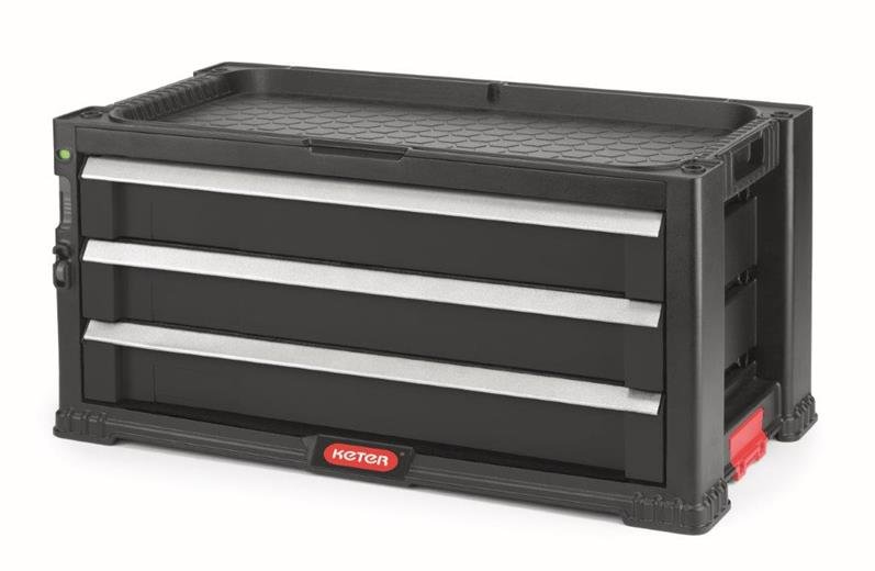 Úložný box na nářadí obsahuje 3 zásuvky pro uložení drobnějších nástrojů a příslušenství. Jedna ze tří zásuvek je vybavena 16 vyjímatelnými organizéry na drobné příslušenství, jako jsou hřebíky, šroubky, hmoždinky a jiné drobnosti. Organizéry umožňují snadné roztřídění příslušenství podle druhů a velikostí. Všechny dělící příčky v zásuvkách lze snadno vyjmout a vytvořit tak volný prostor pro větší nástroje. Modul se zásuvkami lze zajistit proti otevření vestavěným posuvným zámkem. Nechybí ani očko pro zajištění visacím zámkem.