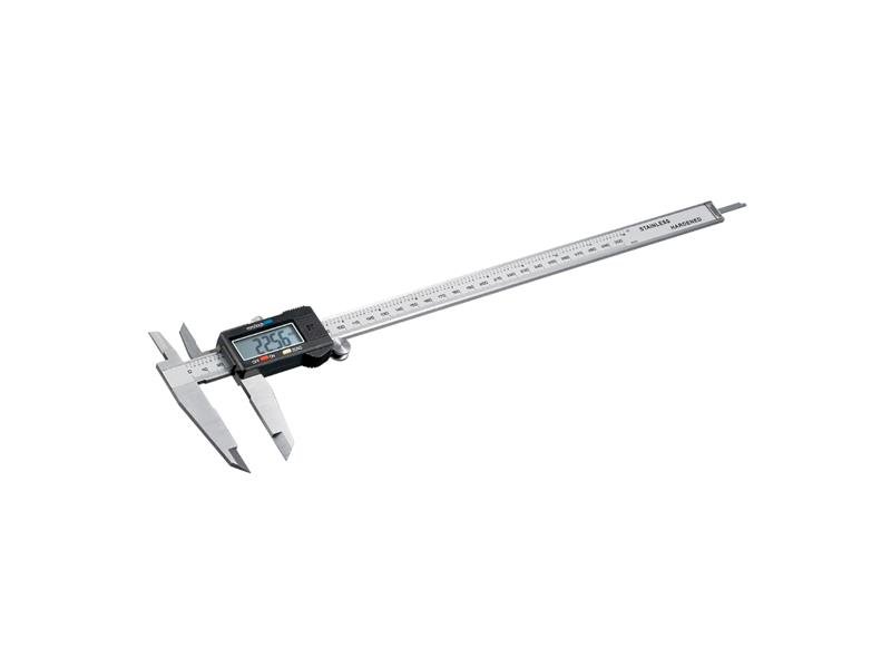 pro měření od 0 mm do 300 mm Digitální posuvné měřítko pro domácnost a průmysl pro venkovní měření hloubky a kroků. Přesnost měření podle DIN 862 (mez chyby: 30 µm) Opakovatelnost: 0,01 mm / 0,0005 palce, Rychlost měření: max. 1,5 m/s Zobrazení volitelně v palcích nebo milimetrech. Jakékoli nastavení nulového bodu pro diferenciální měření. Funguje s jedním knoflíkovým článkem LR44 (součástí balení). 5minutový časovač automaticky vypne displej, aby se šetřila energie baterie. 5minutový časovač automaticky vypne displej, aby se šetřila energie baterie.