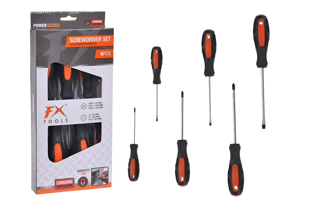 Magnetické šroubováky v saděPraktická šesti dílná sada šroubováků obsahuje křížové a ploché šroubováky. PH0 x 75mm , PH1 x 100mm , PH2 x 125mm a 3 x 75mm , 4 x 100mm , 6,5 x 125 mm.