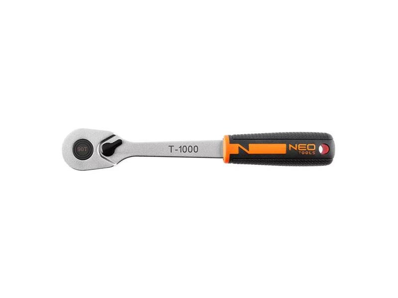 Extrémně odolná ráčna ½ "T-1000 vybavená 90 zuby od značky NEO! Jedná se o nástroj, který překonal pevnost zkušebního stroje a dosáhl rotační síly 1000 Nm. Téměř zdvojnásobil normu , což je asi 520 Nm. Ráčna vděčí za svou mimořádnou odolnost pevné konstrukci a samosvornému ráčnovému mechanismu . Posílena byla i konstrukce nájezdového náměstí. Je vybavena 90 zuby a roztečí 4 o , vyznačuje se patřičnou přesností a zaručuje pohodlí při používání.Nástroj je vyroben z kombinace chrom-vanadiové a chrom-molybdenové oceli. Rukojeť ze dvou materiálů zajišťuje pevné a pevné uchopení a přiložená krabička umožňuje pohodlné skladování a přepravu ráčny NEO.