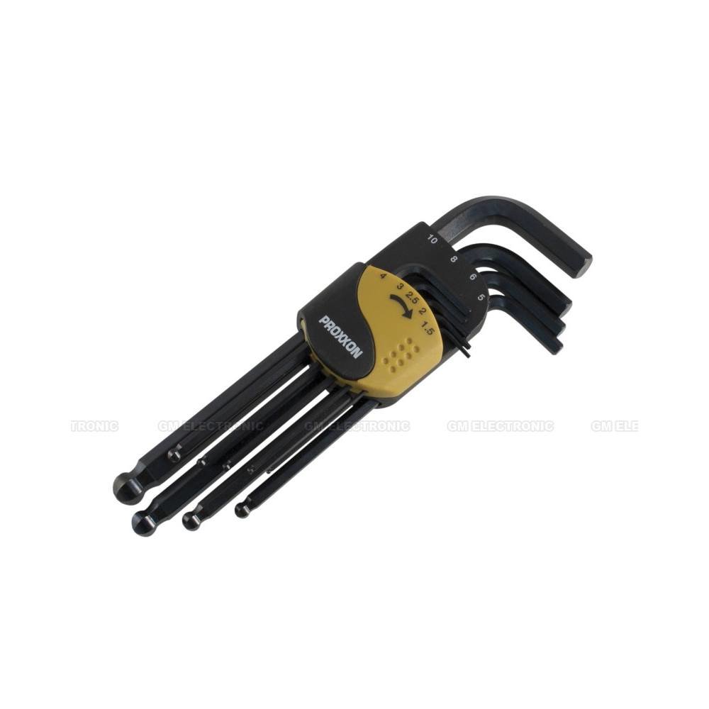 Klíče inbus z CrV oceli s kulovou hlavou na delším konci klíče. Kulovou hlavou povolíte šrouby i v různých úhlech, když nemáte dostatek místa. Klíče jsou uložené v praktickém plastovém držáku s číselným označením jednotlivých klíčů. Možné zavěsit.