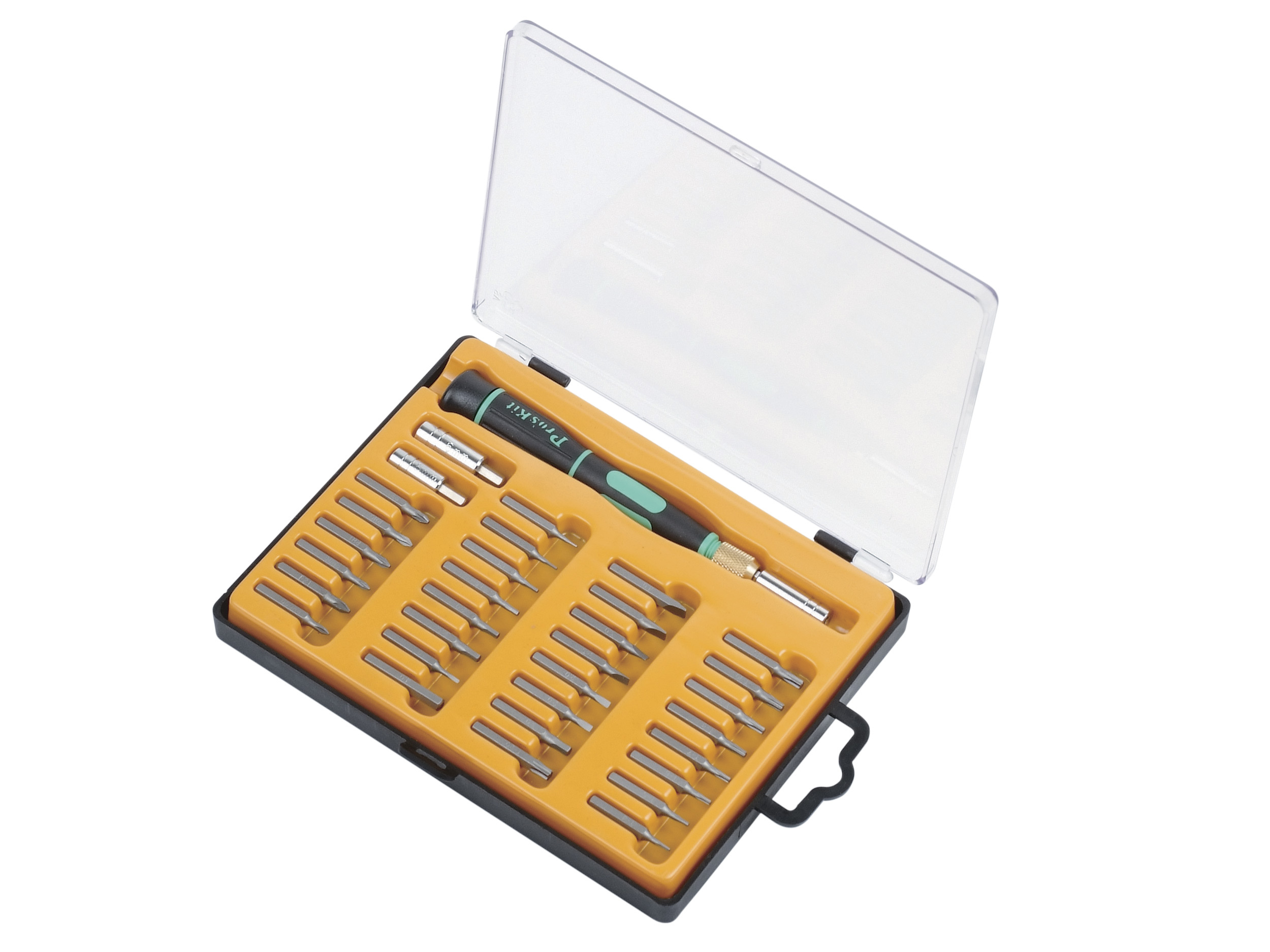 Šroubovák se sadou 33-ti bitů. Hladká otáčecí hlava rukojeti pro snadné šroubování. Ergonomický design s neklouzavým držadlem z termoplastu pro pohodlné ovládání. Šroubovák vybaven sklíčidlem - umožňuje individuální nastavení pracovní délky bitu 45-133 mm. Nastavitelný držák bitů pro snadnou práci na špatně dostupných místech. Sada obsahuje bity: Křížové : PH 000, PH 00, PH0, PH1 Pozidriv: PZ1, PZ0 Ploché: 1,0; 1,5; 2,0; 2,5; 3,0; 3,5; 4,0 Torx: T4, T5, T6, T7, T8, T9, T10, T15, T20 Inbus: H0,7, H0,9, H1,3, H1,5, H2,0, H2,5, H3,0, H4,0 Nástrčkové (šestihran): M5, M6 Krabička (rozměry: 18,7 x 13,5 x 2,2 cm) s očkem na pověšení pro snadné přenášení a skladování. Hmotnost celé sady: 0,253 kg