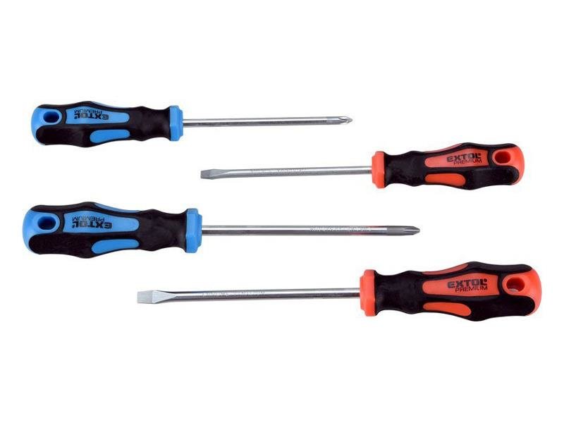 Šroubováky, sada 4ks, 2x (-), 2x (PH), CrV, EXTOL PREMIUMŠroubovák s rukojetí z TPR pryže v kombinaci s plastem, CrV kov v matové úpravě.