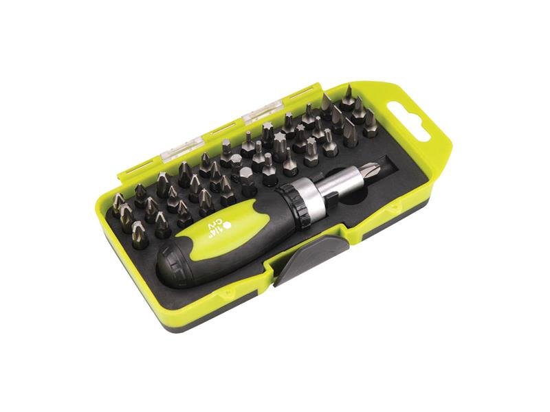 Ráčnový šroubovák zakončený 1/4" šestihranem, se zásobníkem na hroty v rukojeti Rozměry: (-) 3-4-5-6-6-7mm, PH 0-1-1-2-2-2-3-3, PZ 0-1-1-2-2-2-3-3, HEX 1,5-2-2,5-3-4-5-6mm, T 8-10-15-20-25-27-30-40 Materiál: CrV