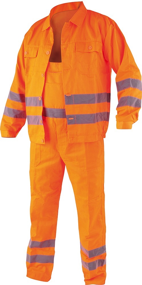 Pracovní oděv (blůza + kalhoty s laclem), oranžová barva s reflexními pruhy.