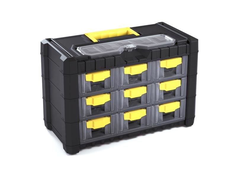 Plastová skříňka na šroubky, vruty, hmoždinky apod. Přehledné uložení a snadné přenášení.
