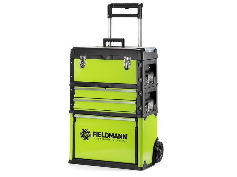 Novinka v sortimentu značky Fieldmann - třídílný box na nářadí FDN 4150, je vyrobený z kovu, má tedy bytelnou konstrukci, která zajistí odolnost i bezpečí pro uložené věci. S jeho pomocí snadno, rychle a bez větší námahy dopravíte množství nástrojů, příslušenství a drobného materiálu i na větší vzdálenosti např. na chalupu, na stavbu apod. Jednotlivé části boxu jsou členěny tak, aby měl každý nástroj či materiál své místo a uživatel nemusel ztrácet čas zdlouhavým hledáním. V menších přihrádkách ve víku horního boxu uložíte drobný, např. spojovací materiál, o kterém budete mít perfektní přehled díky krytu z průhledného pevného plastu. Vyjímatelná plastová přihrádka s rukojetí pak pojme další drobnosti a nářadí a v boxu zbyde ještě dost prostoru na větší nástroje. Druhý díl nabízí dvě výsuvné zásuvky s dostatkem místa např. pro sadu nejčastěji používaných šroubováků nebo klíčů. Spodní díl - velký úložný box s výklopným víkem - pak poskytuje opravdu velkorysý prostor pro pomocníky větších rozměrů, jakými jsou elektrický šroubovák, vrtačka, bruska apod. Všechny tři boxy jsou opatřeny vyklápěcími madly, aby je bylo možné přenášet i jednotlivě. Každý z nich je po stranách vybaven také bytelnými přezkami, kterými se mezi sebou vzájemně propojí v jeden pevný celek, aby byla zajištěna stabilita i bezpečnost celé sady při převážení. Robustní teleskopické madlo poslouží při převozu, při manipulaci s jednotlivými částmi ale nebude překážet. Kolečka z tvrzeného plastu zaručují dlouhou životnost celého boxu.