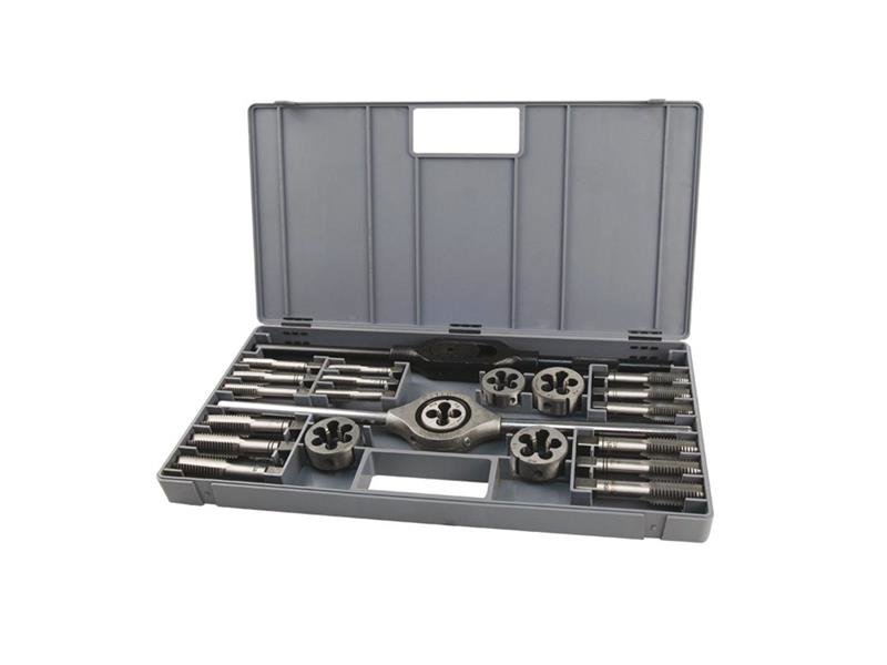 Sada závitníku a oček M12-M14-M16-M18-M20 Sada určená na řezání velkých závitů M12-M20, všechny nástroje v sadě splňují normy DIN 223, DIN 352 Závitníky a závitová očka z kvalitní nástrojové oceli chrání pevná plastová kazeta