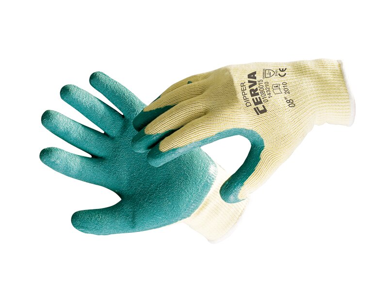 Pletené bezešvé nylonové rukavice. Polomáčené v latexu. číst celé