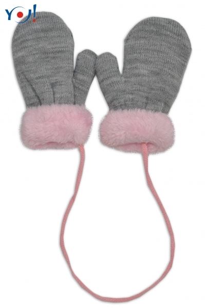 Zimní kojenecké rukavičky s kožíškem - se šňůrkou YO - šedé/růžový kožíšek; 80-92 (12-24m)