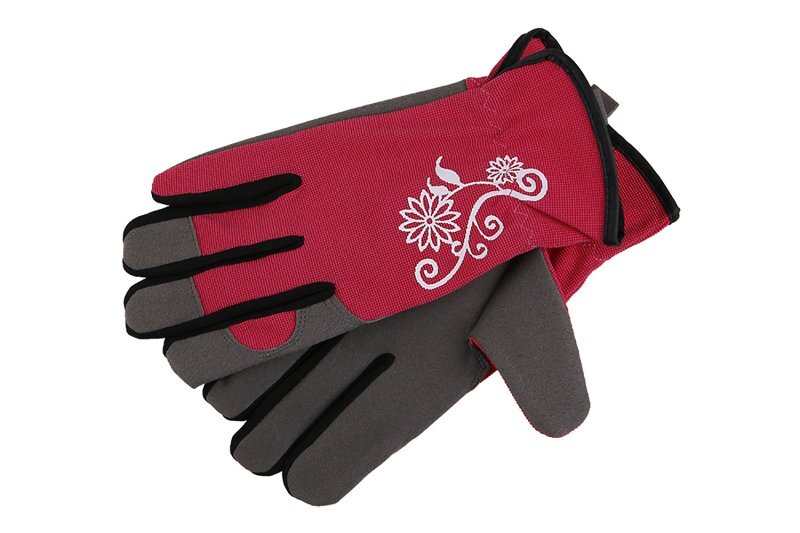Rukavice speciálně vyvinuté pro zahradní práce z umělého semiše v dlani, hřbet rukavice je z elastické tkaniny Spandex, se stahovací gumičkou na zápěstí, ozdobný potisk. Velikost 9.