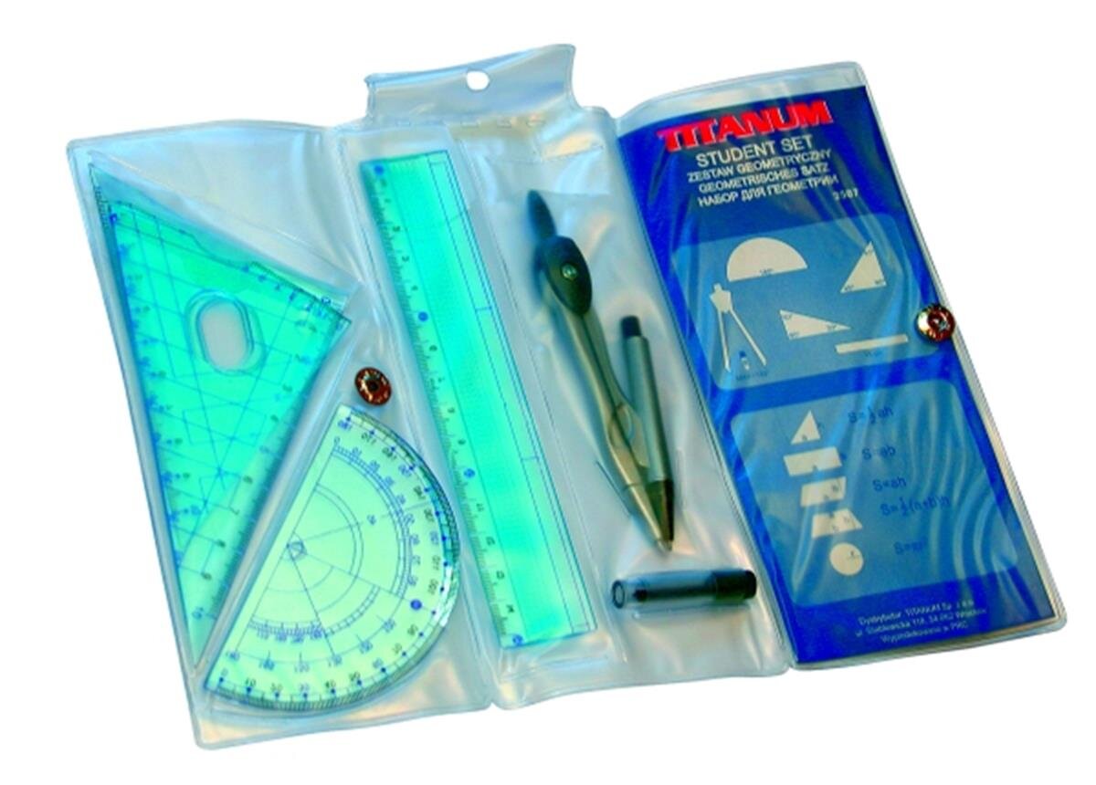 komplet geometryczny sześcioelementowy w etui PCV w zestawie: cyrkiel z ołówkiem automatycznym, linijka, kątomierz, 2 ekierki, zapas grafitów číst celé
