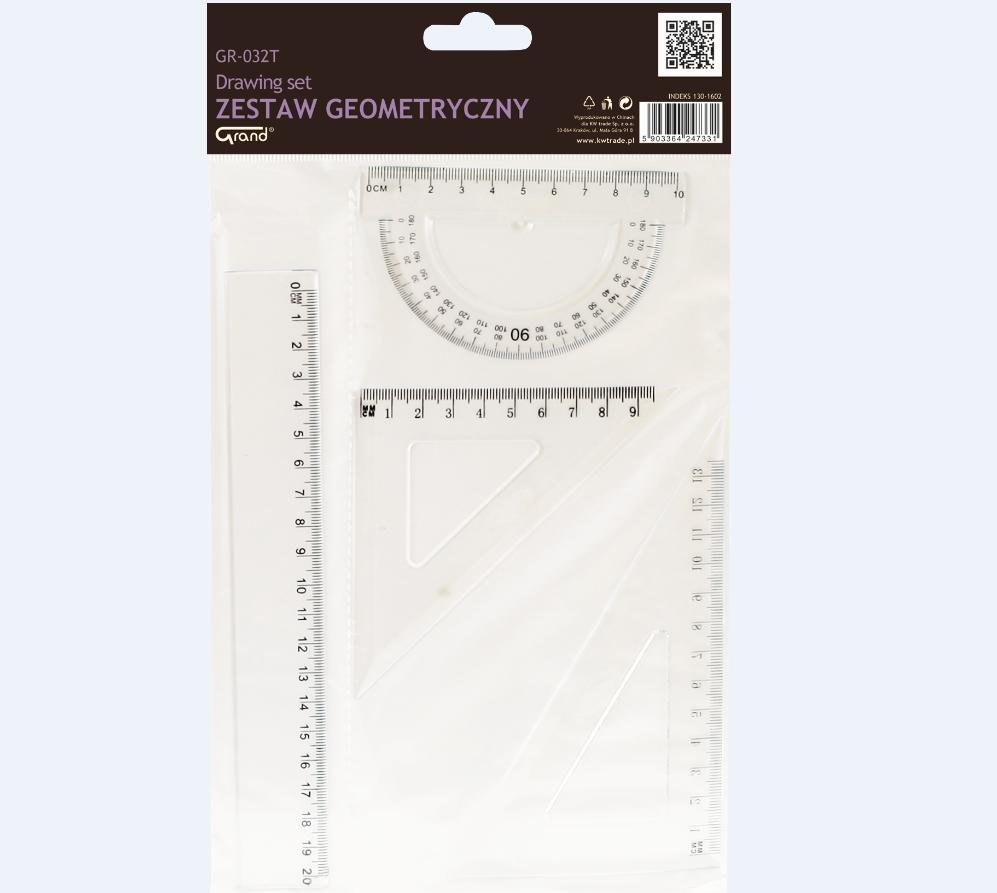 zawiera 4 elementy: linijka 20 cm, ekierka 9,5 cm, ekierka 13,5 cm, kątomierz 10 cmwykonane z polistyrenu; transparentne číst celé