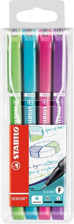 STABILO SENSOR VYSOKÝ VÝKON - I POD TLAKEM Pro všechny, kdo hodně píší a přitom jim záleží na komfortu při psaní. Exkluzivní jemný inkoustový liner v propracovaném hliníkovém pouzdře. Hrot zasazený v kovovém pouzdře s patentovaným mikroodpružením odolá každému tlaku při psaní. Pocit uvolněnosti při psaní - hrot se neohýbá, neláme a nezapadne. Excelentní comfort při psaní - také při vyšší a dlouhodobé zátěži. Vhodný též pro práci s pravítkem. Šířka stopy 0,3 mm. Ve čtyřech v kanceláři nejvíce používaných barvách.