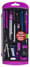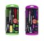Zestaw cyrkli do użytku szkolnego w trzech kolorach: zielonym, żółtym oraz fioletowym. Doskonały do kreślenia precyzyjnych okręgów i łuków o różnej wielkości dzięki płynnej i stabilnej regulacji. Wykonany z metalu oraz dobrej jakości tworzywa. Zawiera: cyrkiel z długimi ramionami, cyrkiel z krótkimi ramionami i regulacją, przedłużkę, uchwyt do ołówka, dwa grafiony, uchwyt grafionu, ołówek automatyczny na wkłady 0,5 mm, zestaw rysików do ołówka, gumkę, temperówkę, cienkopis techniczny 0,5 mm oraz zapasowy rysik i szpilkę. Całość spakowana jest w plastikowe pudełko, które jest niezwykle wygodne do przechowywania oraz transportu.