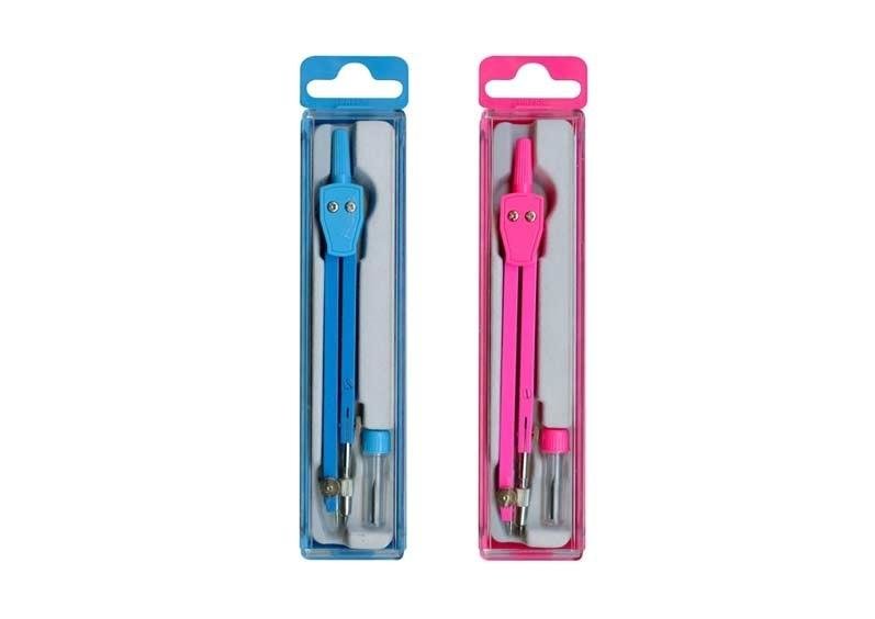 Zestaw do rysowania złożony z 2 części, cyrkiel, zapasowe wkłady ołówkowe. Uniwersalny cyrkiel przeznaczony do kreślenia okręgów o średnicy do 42cm. Możliwość regulacji kąta nachylenia ołówka i oraz igły. Cyrkiel jest zapakowany w plastikowe pudełko.
