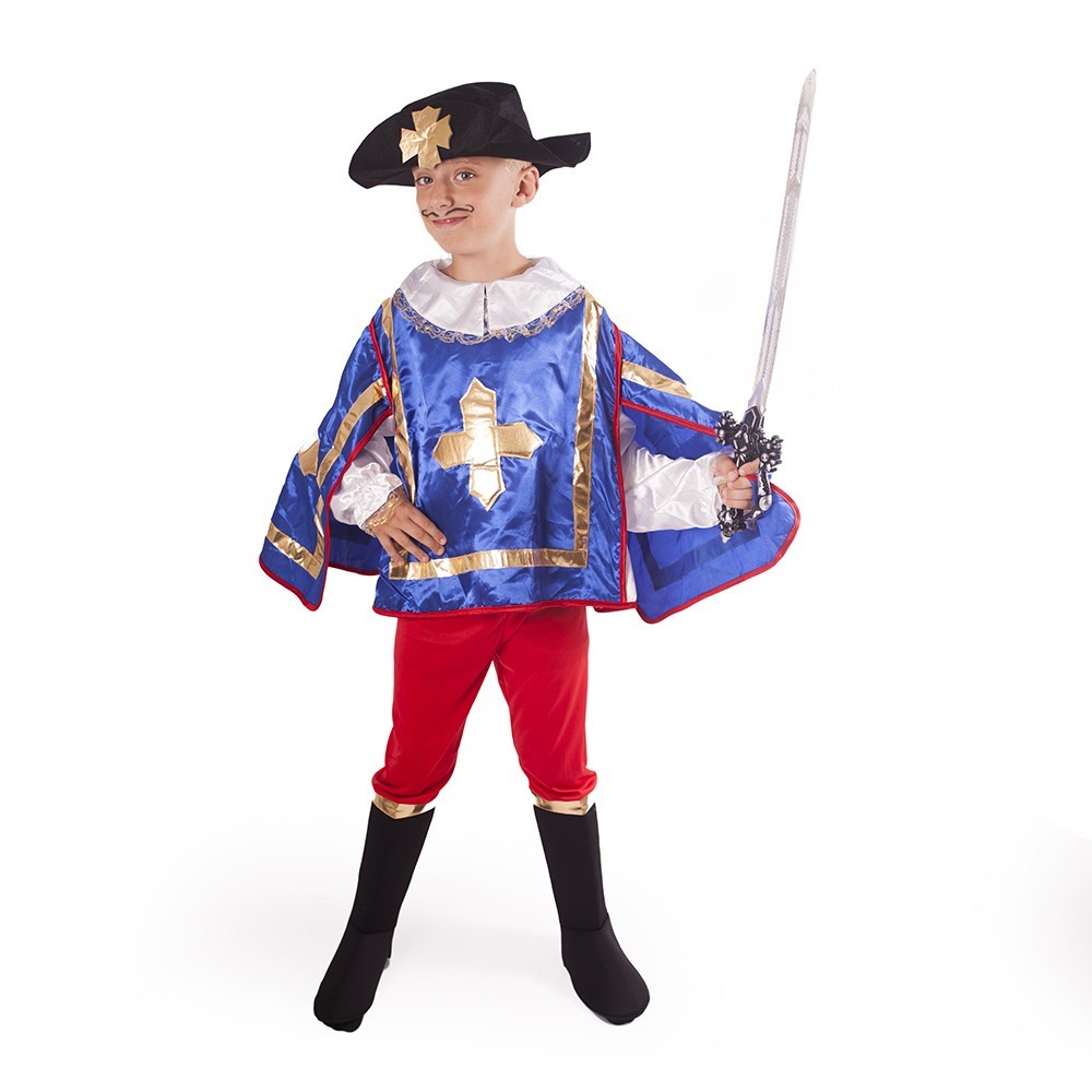 Parádní kostým ve stylu mušketýra nesmí ve tvé karnevalové sbírce chybět! Tento stylový kousek ve velikosti M je určen pro chlapečky ve věkovém rozmezí 6-8 let (116-128 cm). Vrchní díl modro-bílý má zlaté a červené lemování a kříž, spodní díl je červeno-černý s návleky na boty. Součástí je také černý klobouk. Staň se největším frajerem karnevalového večírku díky tomuto kostýmu a ohrom tak všechny své kamarády!