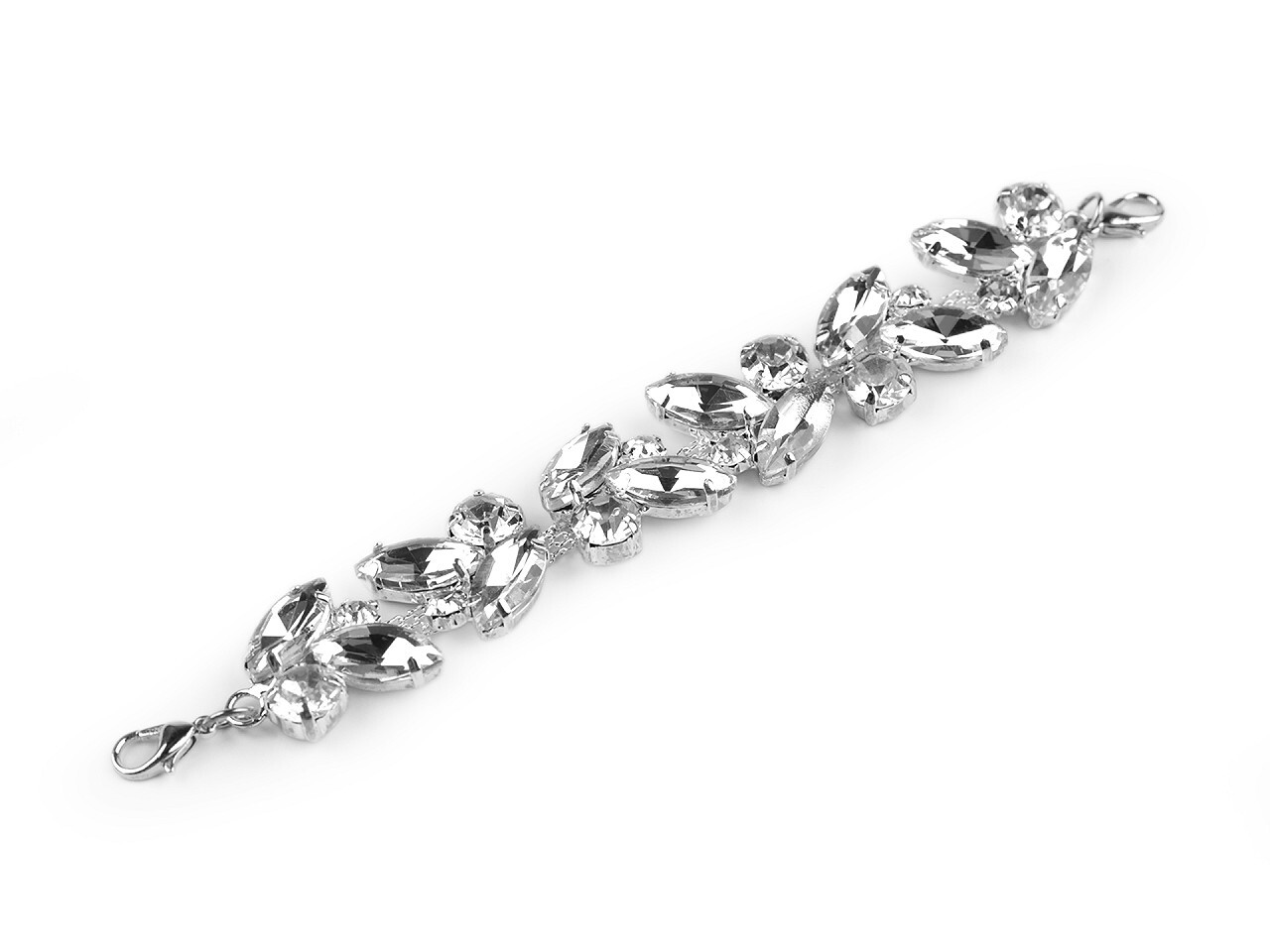 Štrasová ozdoba působí luxusně a elegantně. Na obou koncích má mini karabinky umožňující snadné připevnění k materiálu. Ozdobu můžete připnout na oděvy i doplňky, např. plesové šaty, halenky, saka, psaníčka, kabelky, čelenky i boty. Délka je uvedena včetně karabinek.