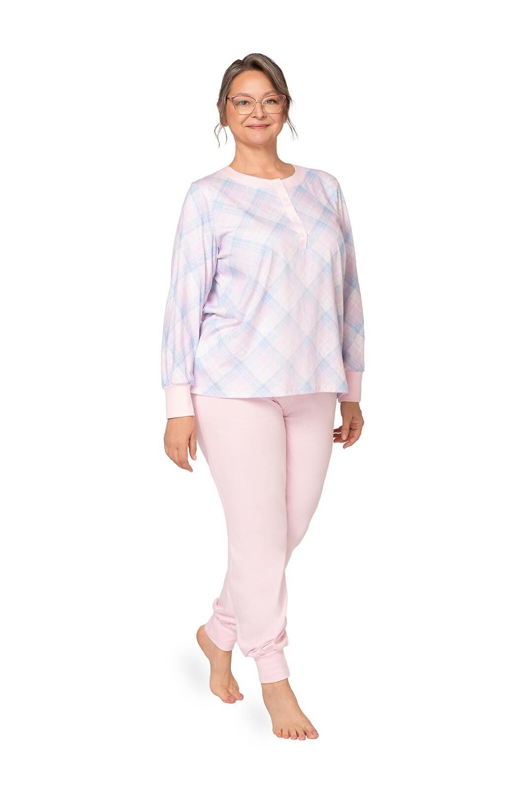 Piżama damska- wysokiej jakości bawełna interlock- koszulka w kratkę, z długim rękawem- dekolt zapinany na guziczki- długie, jednolite spodnie- mankiety i nogawki zakończone ściągaczem číst celé