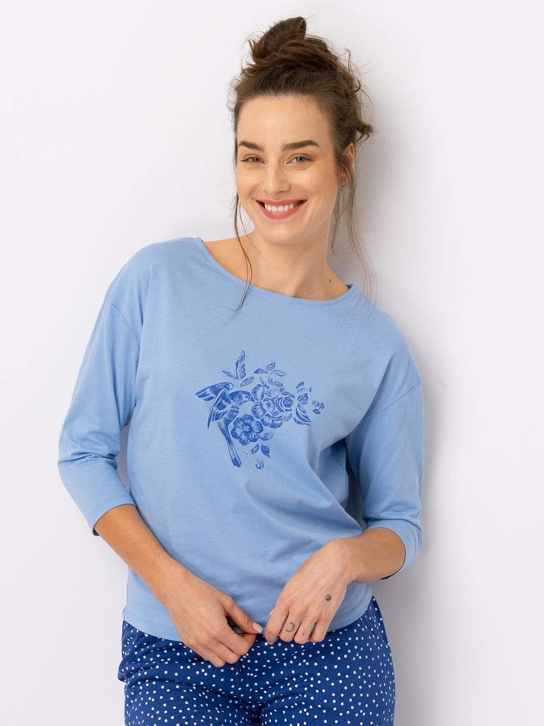 Piżama damska- koszulka jednolita z rękawem 3/4- półokrągły dekolt- przód ozdobiony wzorem- spodnie 7/8 z printem w kropki- dwie kieszenie- w pasie wygodna gumka, obszyta bawełną číst celé
