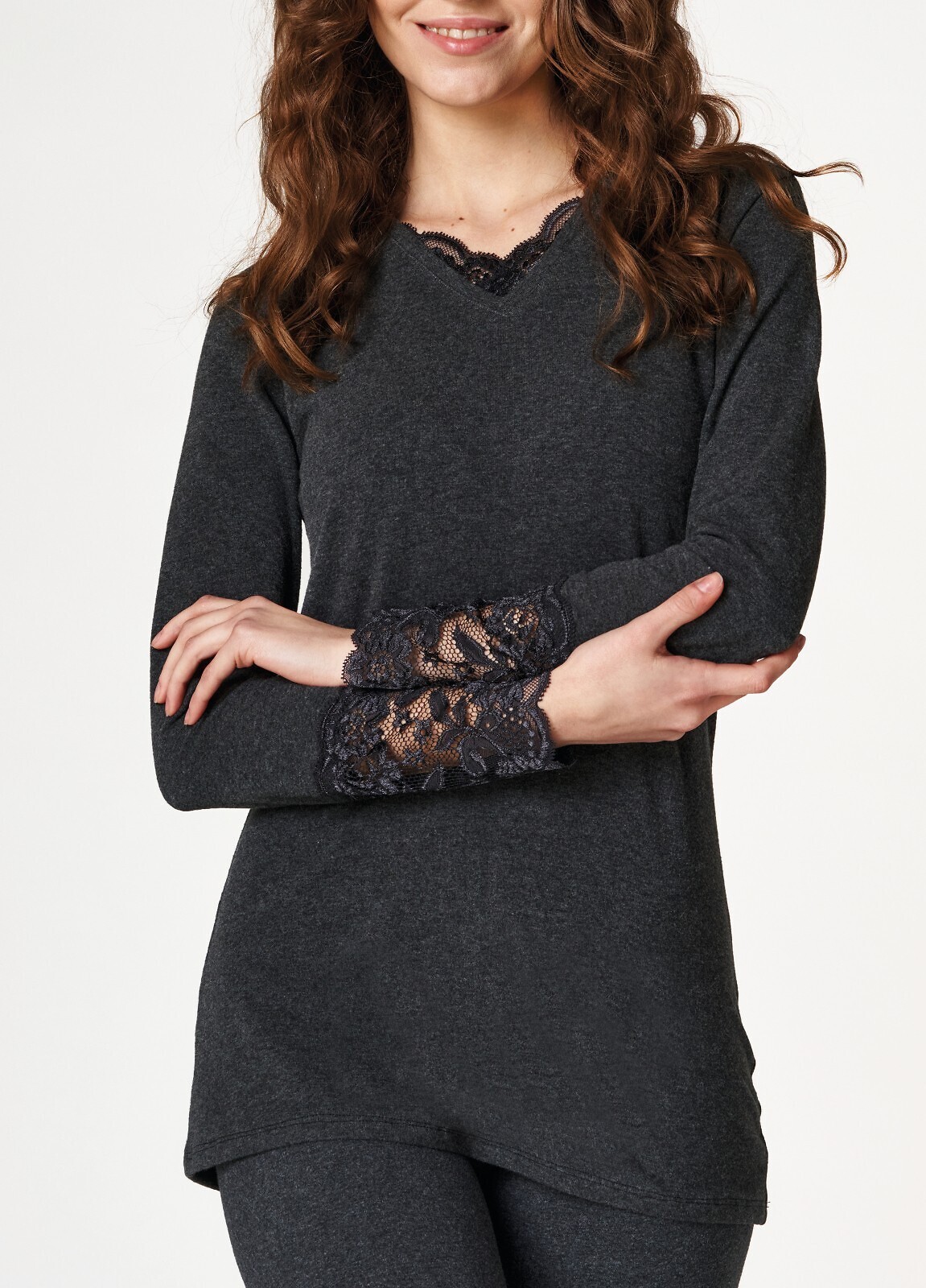 Ciepła koszulka damska- miękka i miła w dotyku dzianina, obustronnie drapowana- dekolt w szpic- długi rękaw- rękawy i dekolt obszyte koronką- idealnie przylega do ciała