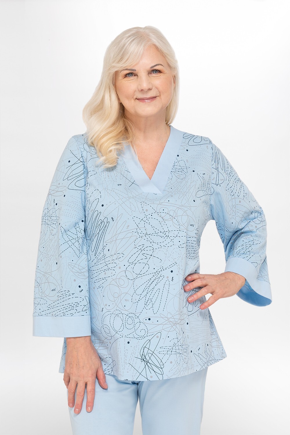 Elegancka piżama damska- koszulka zdobiona geometrycznym wzorem- dekolt w szpic- długi, szeroki rękaw- gładkie spodnie- długa, prosta nogawkaSkład: 100% bawełna číst celé
