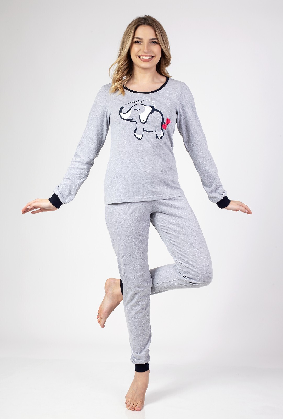 Bawełniana piżama damska- koszulka z długim rękawem- dekolt półokrągły- z przodu ozdobny nadruk- długie spodnie- nogawki i mankiety obszyte ściągaczem