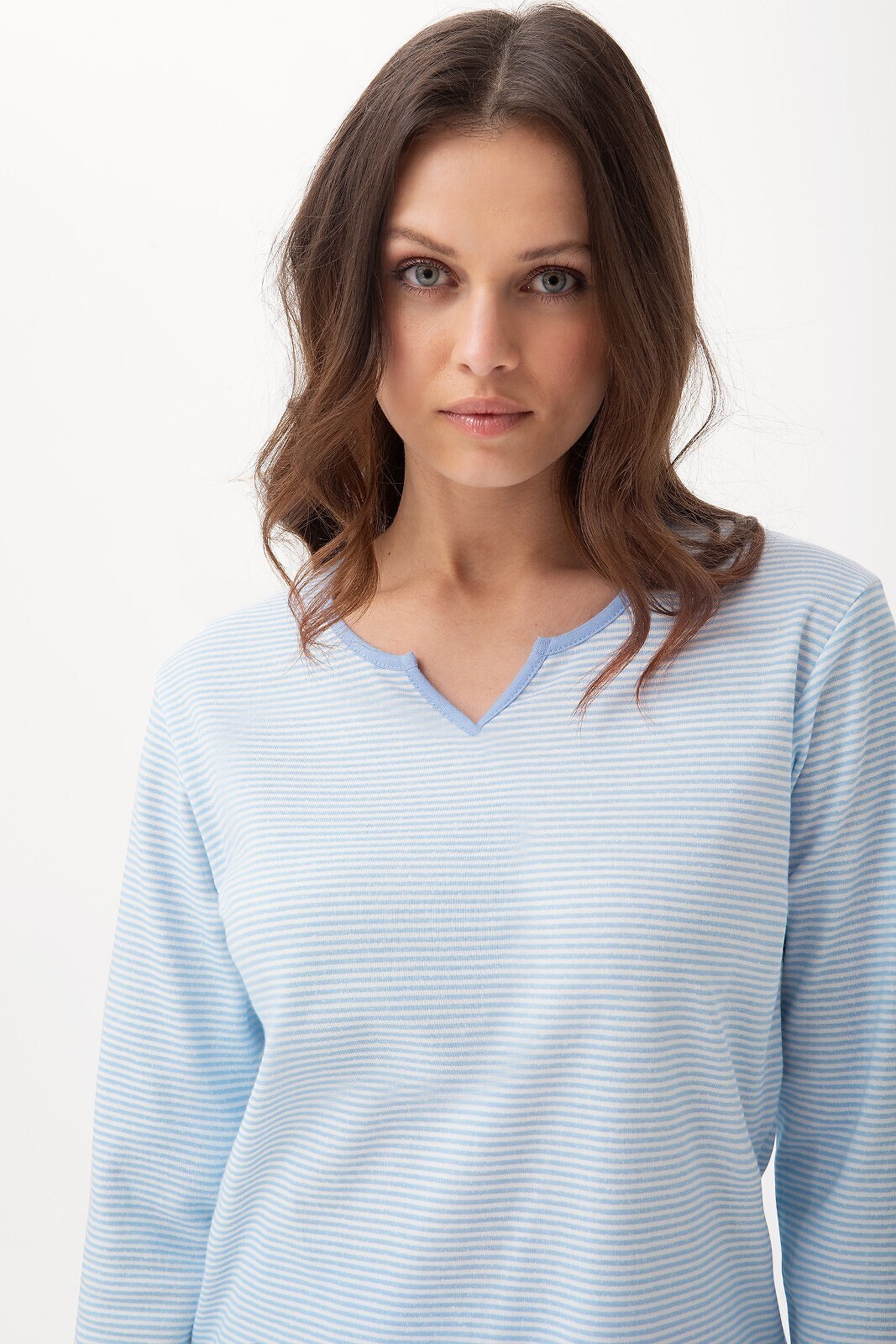 Bawełniana piżama damska- koszulka w paski- długi rękaw- dekolt z efektownym wycięciem- spodnie długie, jednolite číst celé
