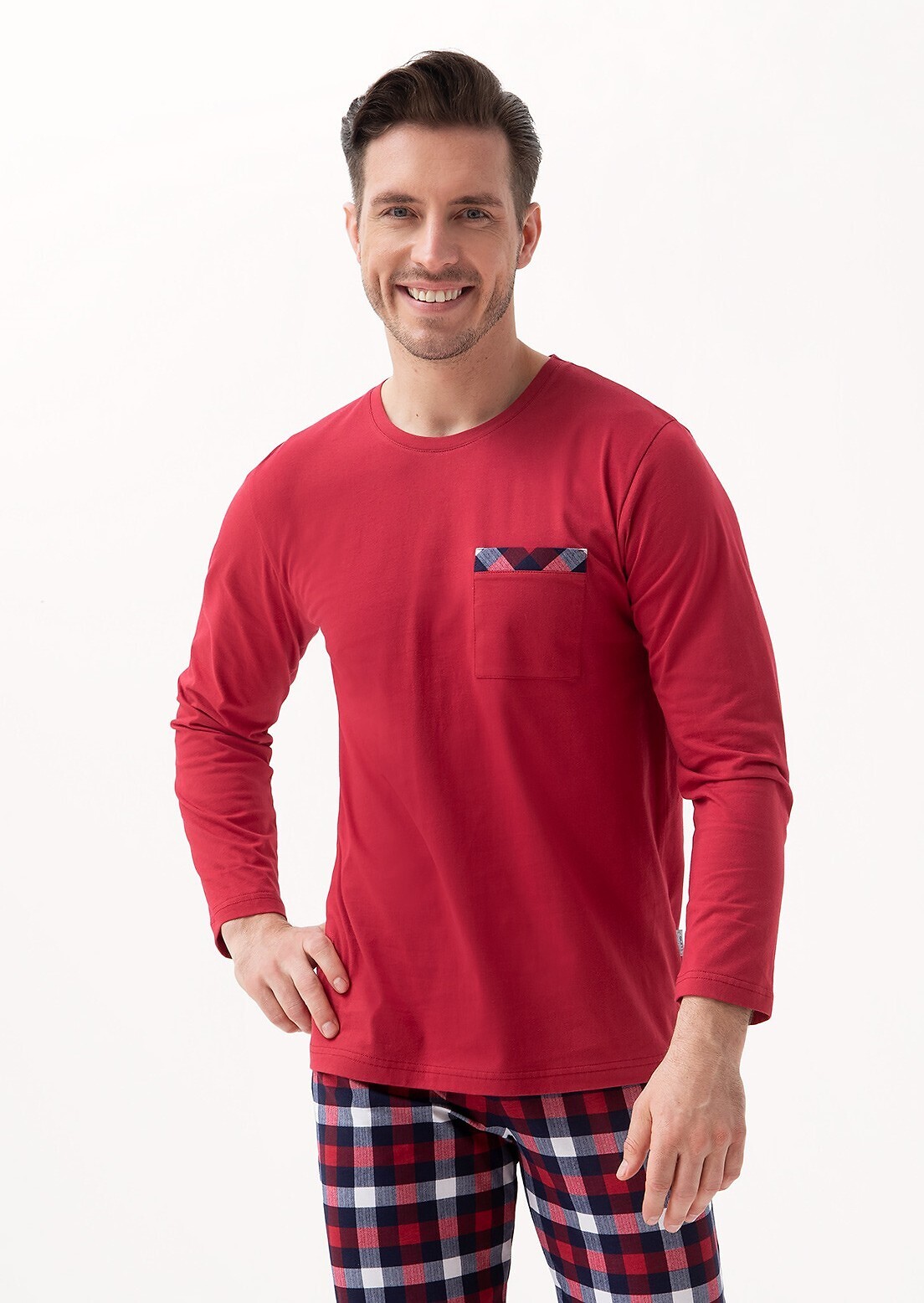Bawełniana piżama męska- koszulka z długim rękawem- dekolt półokrągły- na piersi naszyta kieszonka- spodnie długie, w kratkę