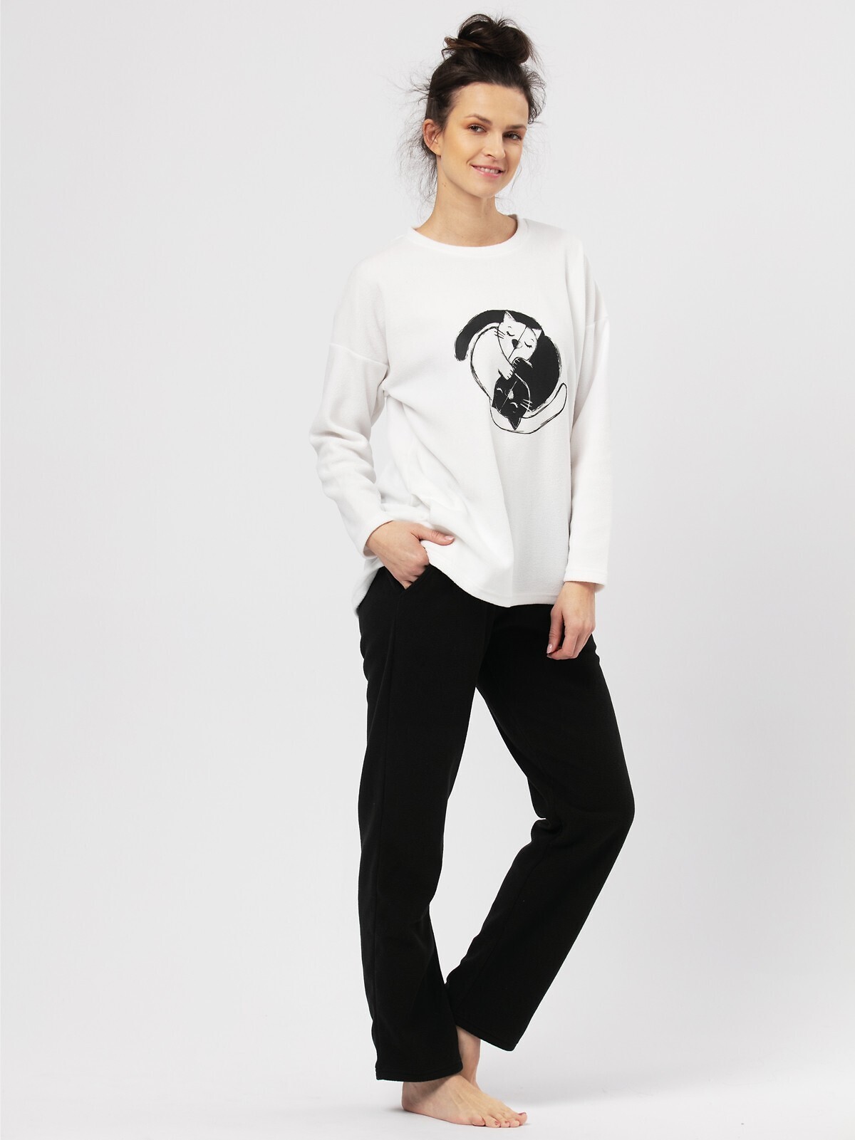 Ciepła piżama damska- dzianina typu soft z miękkiego micro polaru- bluza z długim rękawem, z kieszeniami- z przodu nadruk z kotami- tył bluzy wydłużony- spodnie długie o prostym kroju- na biodrach wygodne kieszenie číst celé