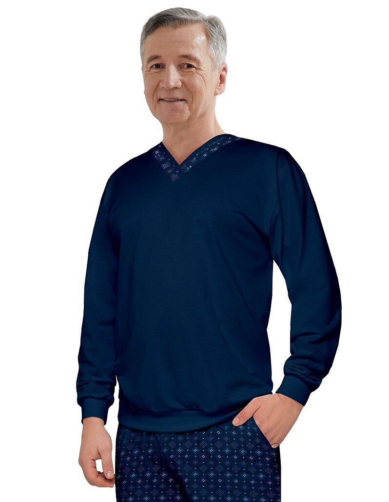 Piżama męska- wysokiej jakości bawełna- bluza jednolita z długim rękawem- wzorzysty dekolt w szpic- na biodrach wygodne kieszenie- nogawki zakończone ściągaczem číst celé