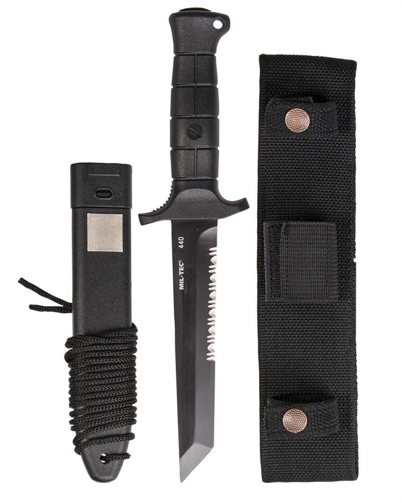 Replika bojového nože KM2000 Bundeswehru s robustní tanto čepelí z oceli 440. Čepel má částečné zubaté ostří. Nůž má ergonomickou rukojeť s očkem. Hmotnost s pouzdrem: 480 g