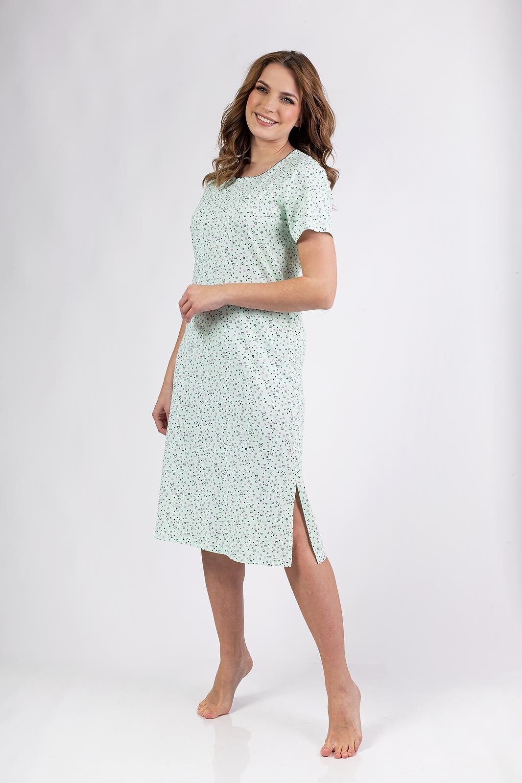 Koszula damska- wysokiej jakości bawełna w serduszka- krótki rękaw- dekolt okrągły- długość do kolan- po bokach małe rozcięcia