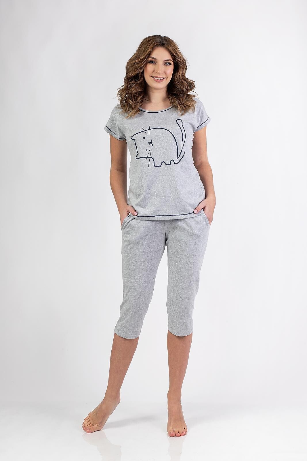 Piżama damska- wysokiej jakości bawełna- koszulka z krótkim rękawem- dekolt okrągły- na wysokości piersi nadruk- spodnie typu rybaczki- w pasie gumka obszyta bawełną- na biodrach kieszenie číst celé