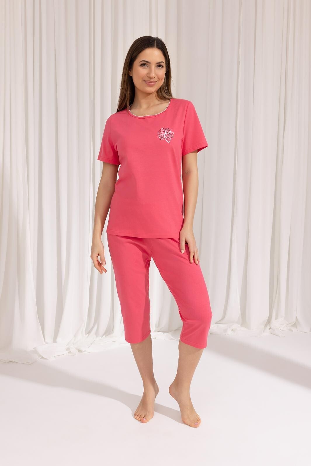 Piżama damska- wysokiej jakości bawełna- koszulka z krótkim rękawem- dekolt okrągły- na wysokości piersi roślinny nadruk- spodnie typu rybaczki- w pasie gumka obszyta bawełną číst celé