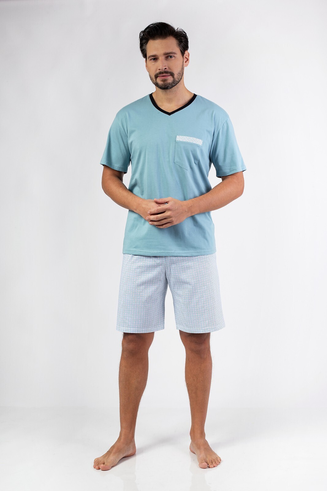 Piżama męska- wysokiej jakości bawełna- koszulka z krótkim rękawem- dekolt w kształcie litery V- na piersi mała kieszonka- spodenki krótkie číst celé