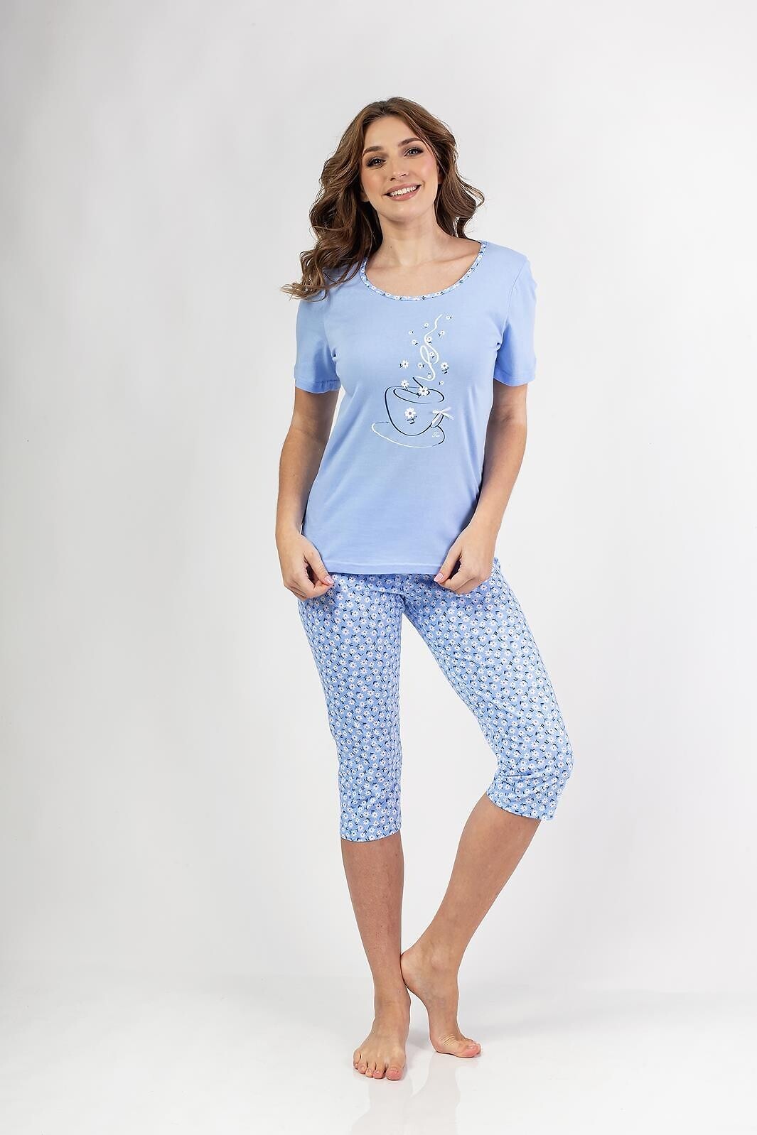 Piżama damska- wysokiej jakości bawełna- koszulka z krótkim rękawem- dekolt okrągły- na wysokości piersi kwiatowy nadruk- wzorzyste spodnie typu rybaczki- w pasie gumka obszyta bawełną číst celé