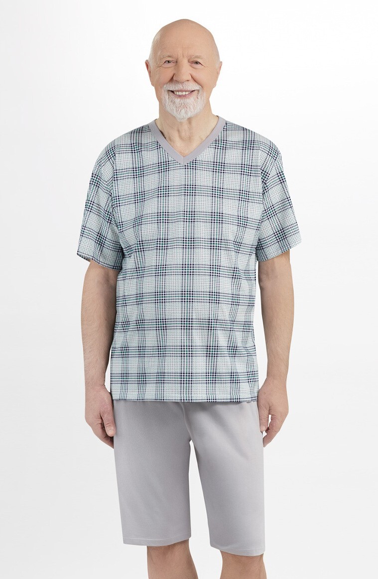 Piżama męska z bawełny- koszulka w kratkę, z krótkim rękawem- dekolt w kształcie litery "V"- do kompletu jednolite, krótkie spodenki z wygodnymi kieszeniami- pakowana w foliowy worek číst celé