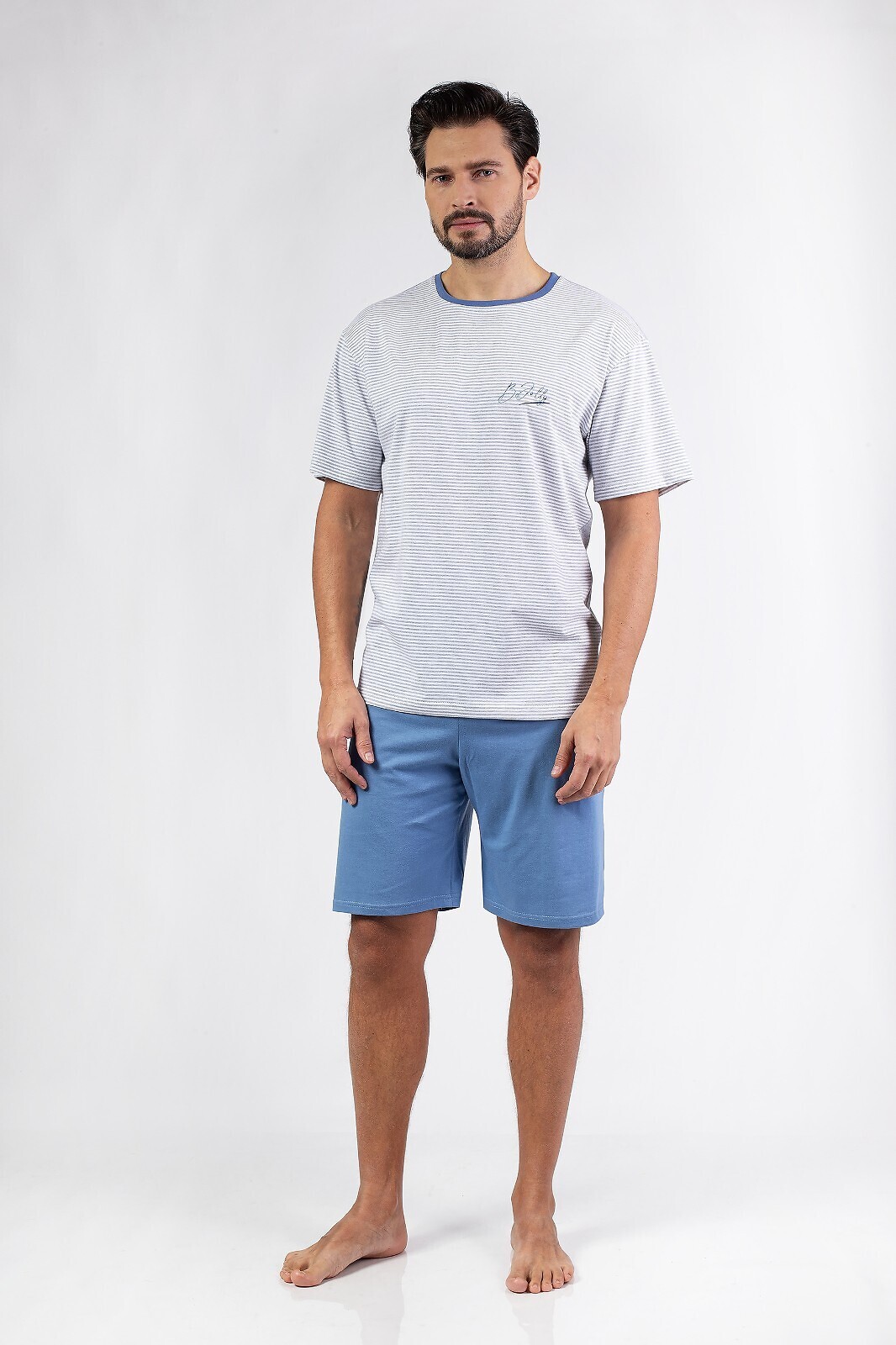 Piżama męska- wysokiej jakości bawełna- koszulka w paski z krótkim rękawem- dekolt okrągły- na piersi mały nadruk- spodenki krótkie, jednolite číst celé