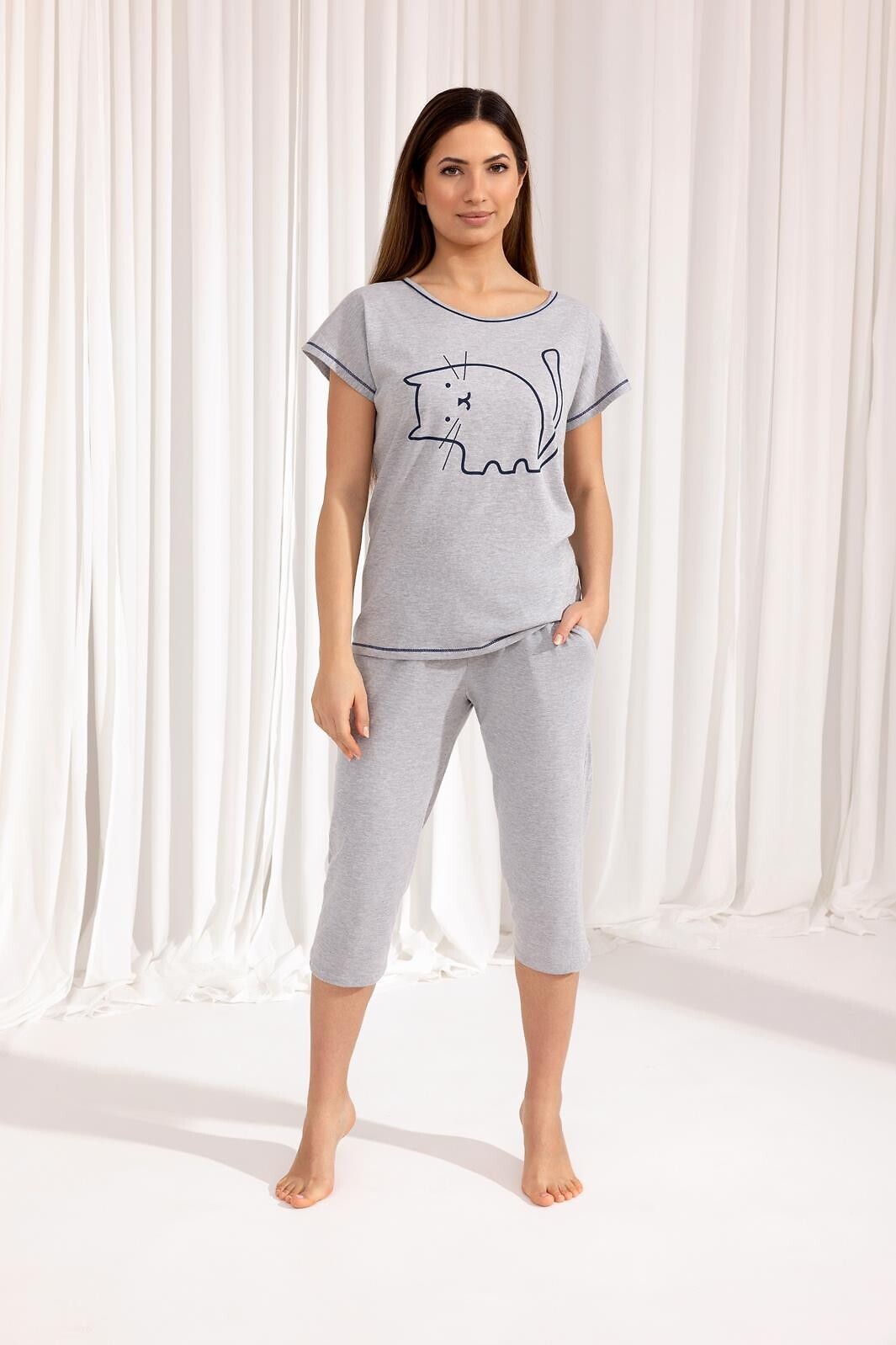 Piżama damska- wysokiej jakości bawełna- koszulka z krótkim rękawem- dekolt okrągły- na wysokości piersi nadruk- spodnie typu rybaczki- w pasie gumka obszyta bawełną- na biodrach kieszenie číst celé