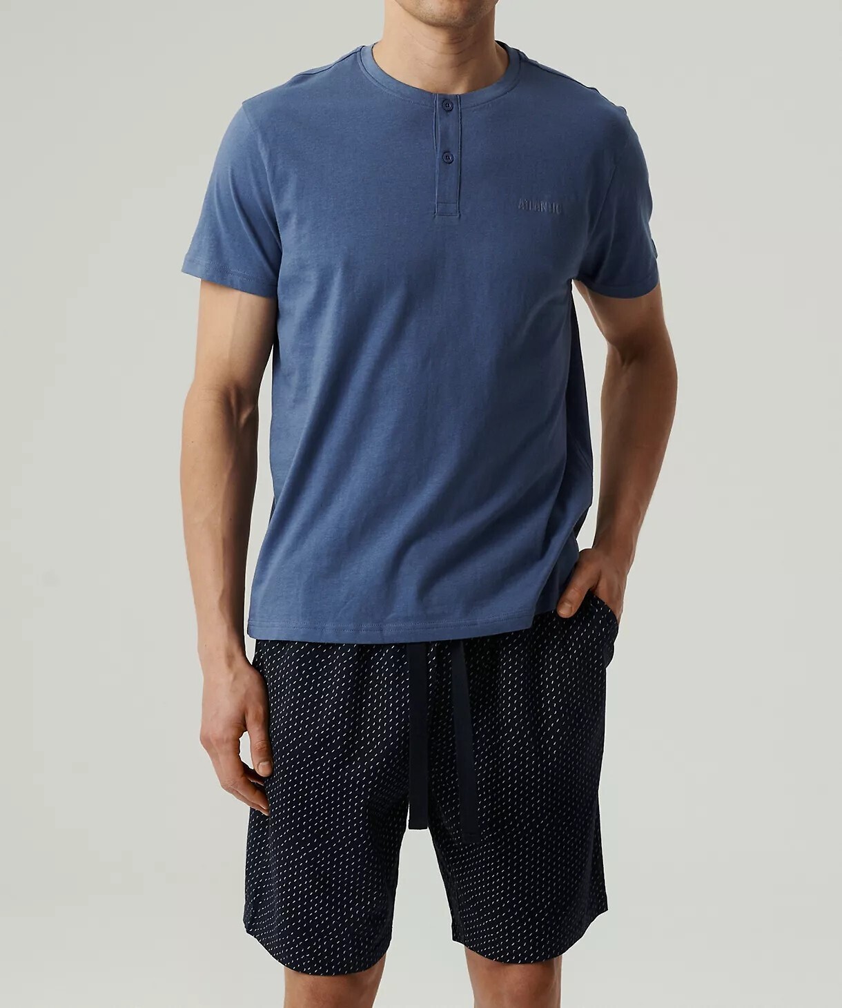 Letnia piżama męska- miękka dzianina z bawełny- koszulka z krótkim rękawem- okrągły dekolt z rozcięciem i dwoma guzikami- luźne, krótkie spodenki ozdobione drobnym wzorem- w pasie guma obszyta dzianiną i wiązany troczek do regulacji obwodu pasa- na biodrach wygodne kieszenie číst celé