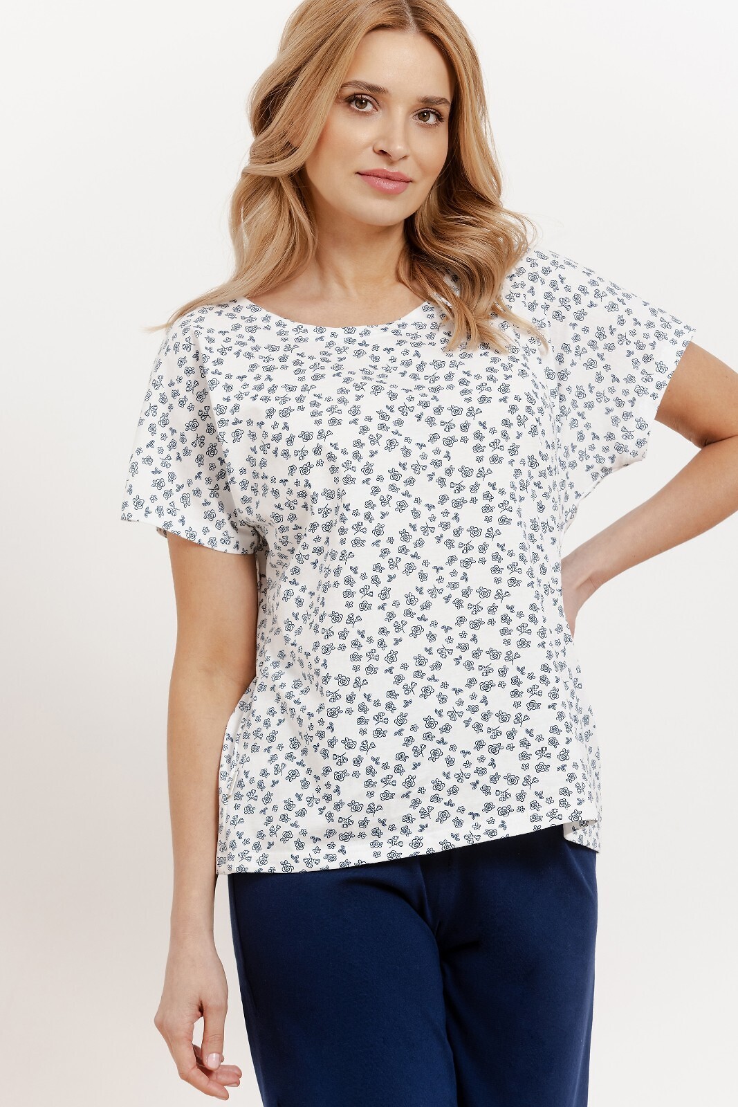 Piżama damska- wysokiej jakości bawełna- wzorzysta koszulka z krótkim rękawem- dekolt półokrągły- jednolite spodnie o długości 3/4- w pasie gumka obszyta bawełną z kokardką